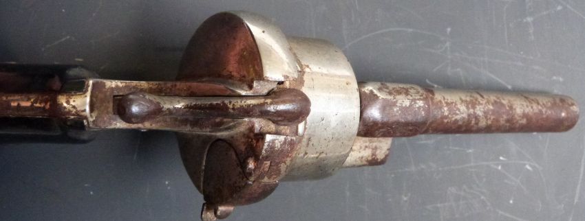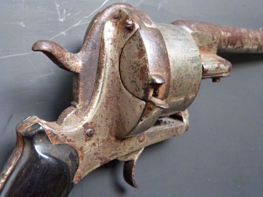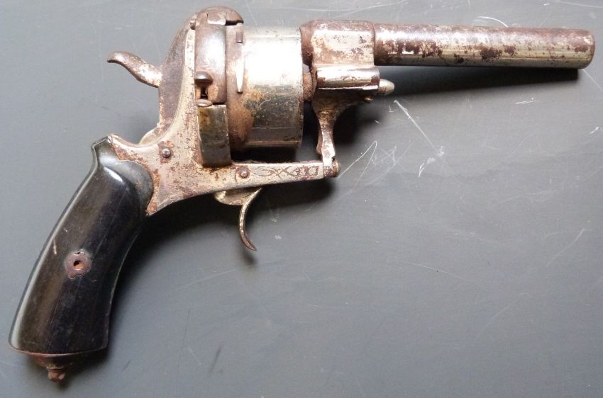 Pinfire 8-shot double action percussion hammer action revolver with engraved frame, shaped wooden grips, belt loop and 4.75 inch barrel, overall length 26.5cm.