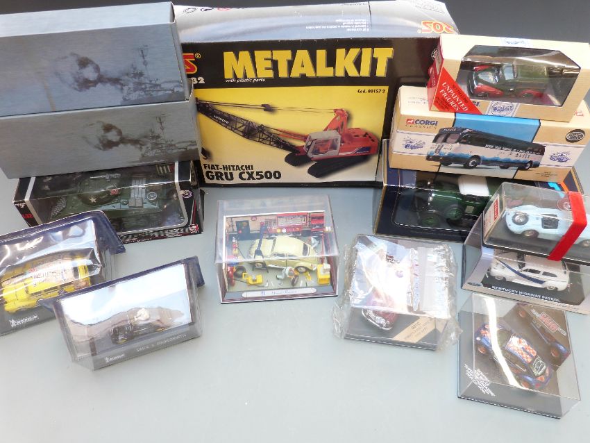 Fourteen various diecast model vehicles including an ROS 1:32 scale Metalkit, Liberty Classics, Atlas Editions ships, Sibur, Corgi Classics, Vitesse etc, all in original boxes.