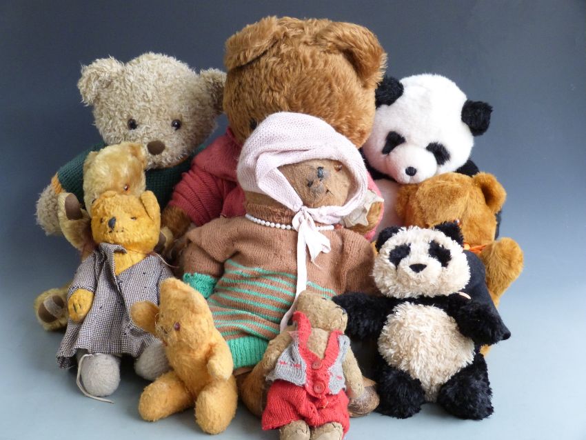 Ten various vintage and modern teddy bears including Merrythought one Cheeky style, Harrods etc, largest 60cm tall.