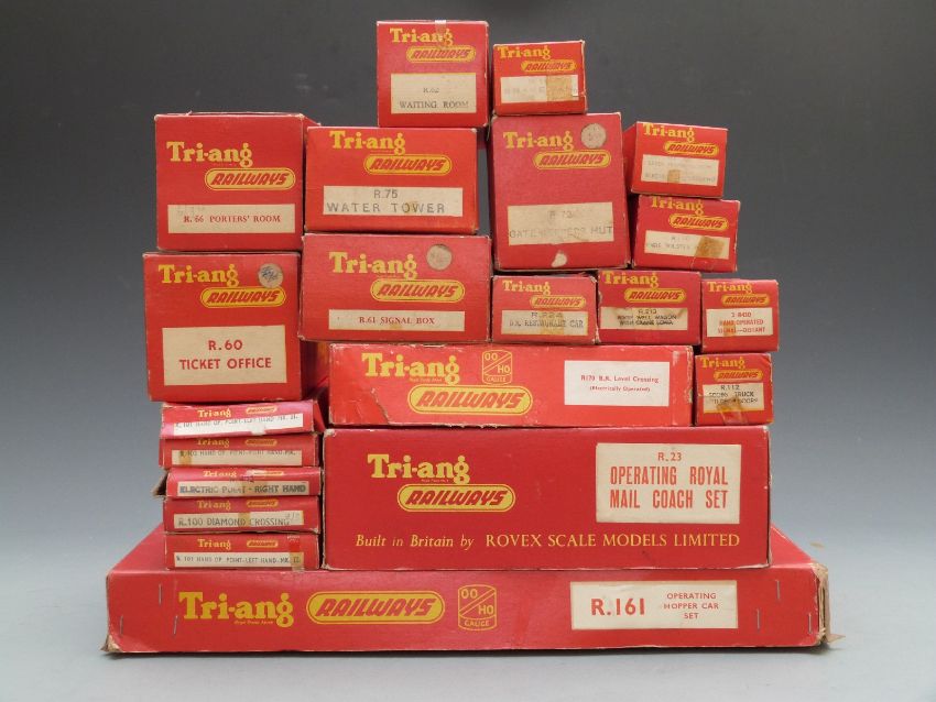 Twenty-one Tri-ang 00 gauge buildings, wagons, coaches, and accessories including Operating Royal Mail Coach Set R.23, Operating Hopper Car Set R.161, Ticket Office R.60, Water Tower R.75, Signal Box R.61, Porter's Room R.66, Gate Keeper's Hut R.72 BR Level Crossing R.170 etc, all in original boxes.