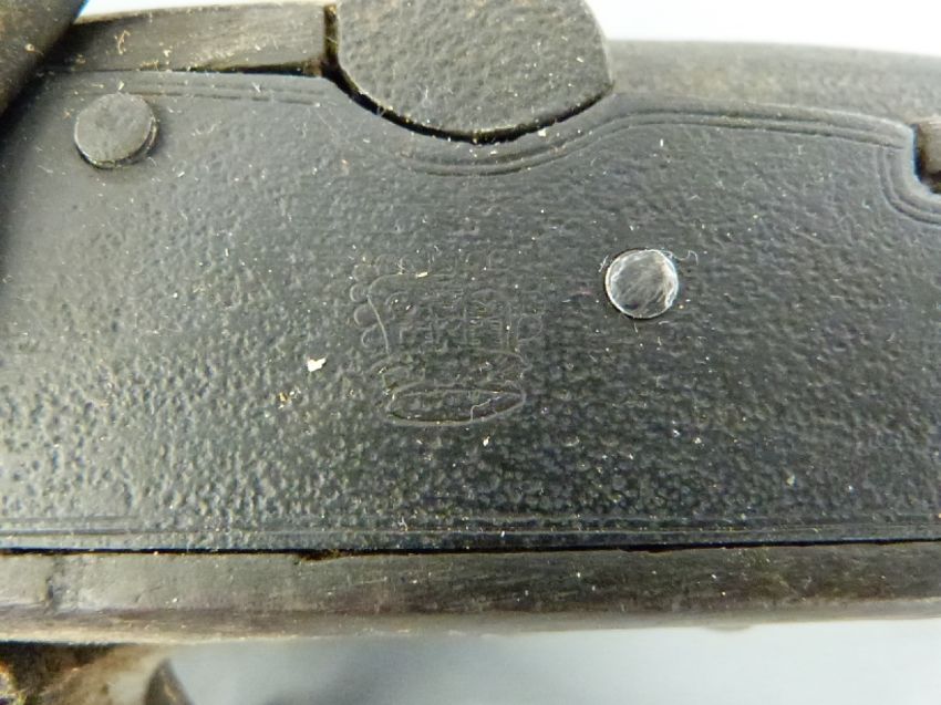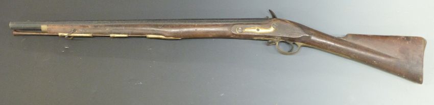 Percussion hammer action cavalry carbine converted from an Elliot flintlock with lock stamped Tower and with crown cypher, brass butt plate stamped L.C.F. 40, brass trigger guard and mounts, sling suspension loops, steel ram-rod, railed stock and 25 inch barrel, overall length 102.5cm.