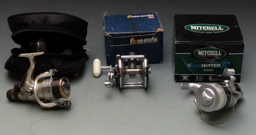 Shimano Exage 4000 RA fixed spool fishing reel with spare spool in case, Mitchell Blue Water R6000 fixed spool reel in box (possibly unused) and a Penn 65 Longbeach multiplier in box