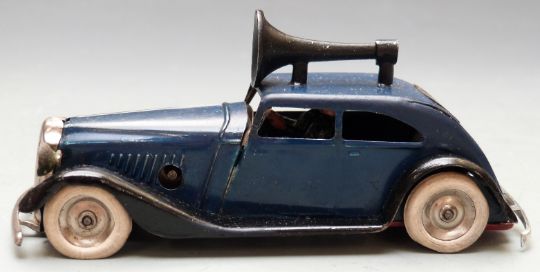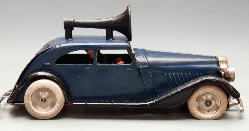 Tri-ang Minic clockwork tinplate Traffic Control Car with blue and black body, loud speaker and two policemen.