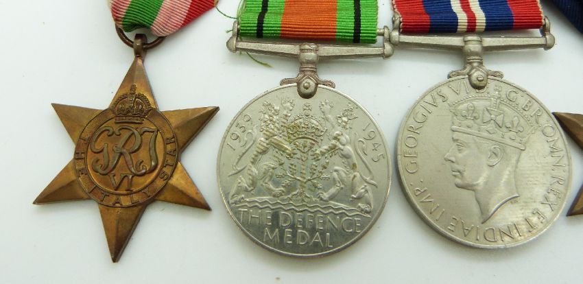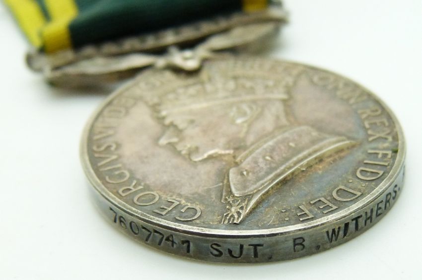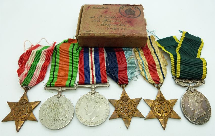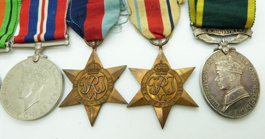 British Army WWII medals comprising 1939/1945 Star, Africa Star, Italy Star, Defence Medal, War Medal and Territorial Efficiency Medal named to 7607741 Sgt B Withers REME, with box