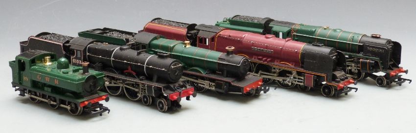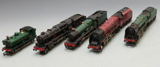 Five Hornby and Airfix 00 gauge locomotives comprising LMS 4-6-2 Duchess of Sutherland 6233, BR 2-10-0 Evening Star 92220, LMS 4-6-0 Royal Scots Fusiliers 6103, BR 4-6-0 Kneller Hall 5934 and GWR 0-6-0 8751.