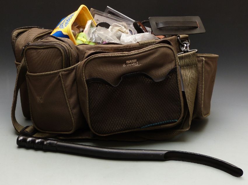 Nash tackle bag with detachable zip up belt bags, accessories including swimfeeders, weights, traces, braid etc