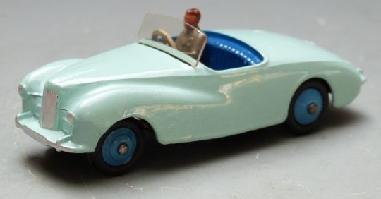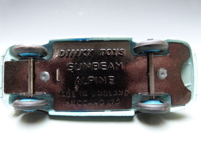 Dinky Toys diecast model Sunbeam Alpine Sports with pale blue body, dark blue interior and hubs and driver, 101, in original box.