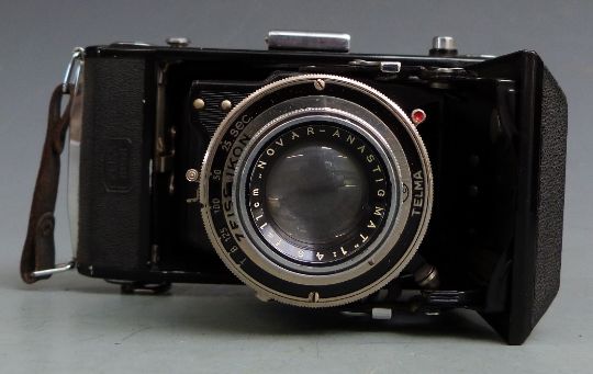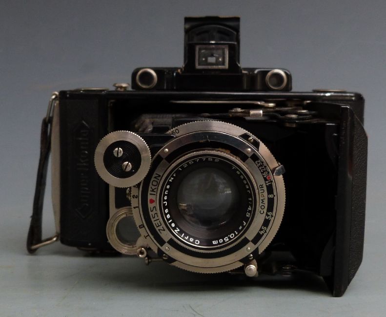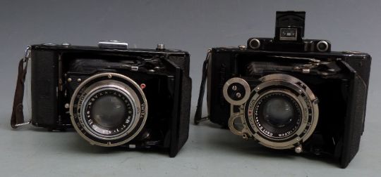 Two Zeiss folding bellows cameras comprising Super Ikonta 530/2 with Tessar 1:4.5 f=10.5cm lens and Nettar 515./2 with Novar 1:4.5 f=11cm lens
