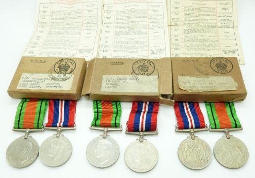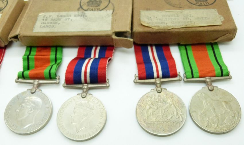 Royal Air Force WWII boxed medals comprising three pairs of Defence Medals and War Medals addressed to P Gooacre, West Kirby, A Powell, Whitchurch, Cardiff and J Leach, Darwen, Lancs