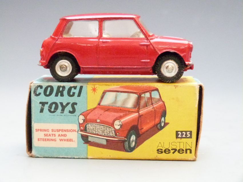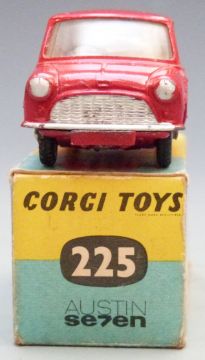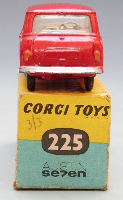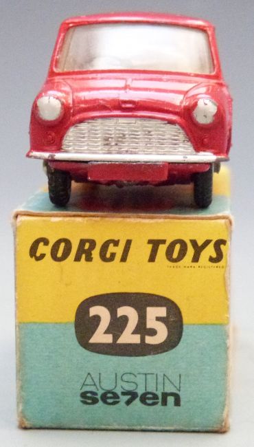 Corgi Toys diecast model Austin Seven with red body and lemon interior, 225, in original box.