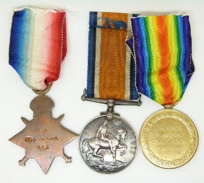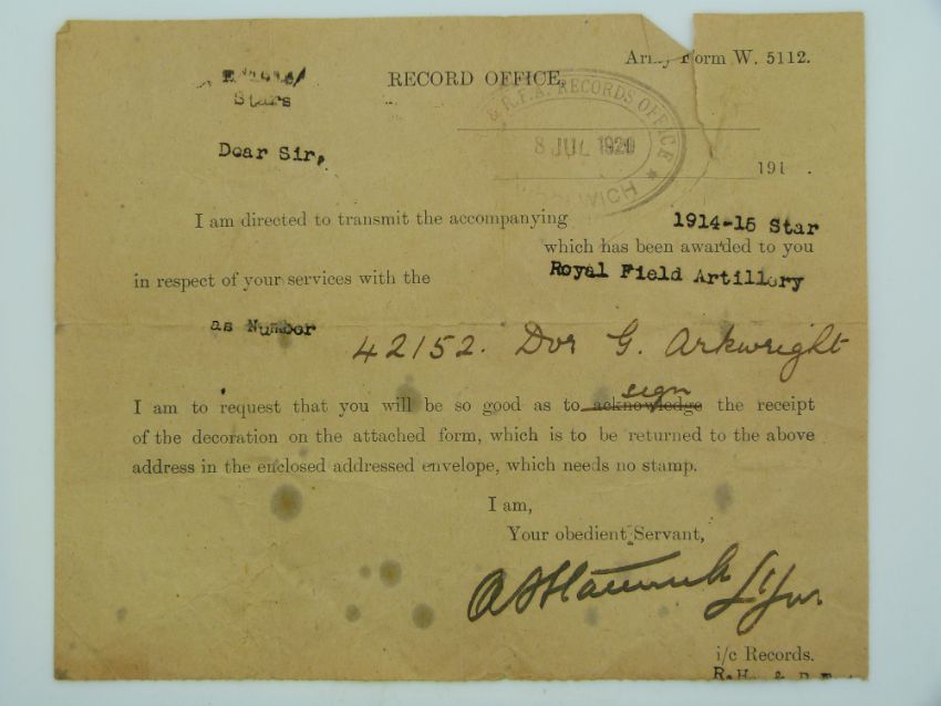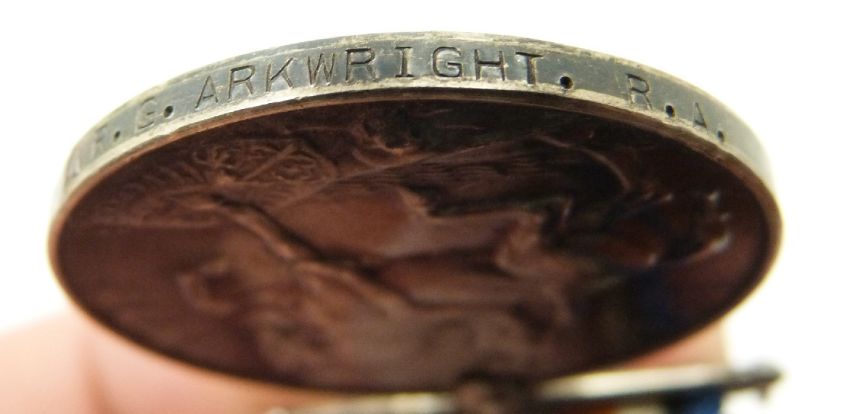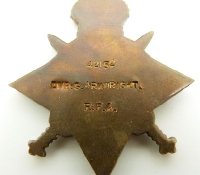 British Army WWI medals comprising 1914/1915 Star, War Medal and Victory Medal named to 42152 Driver G Arkwright, Royal Field Artillery