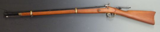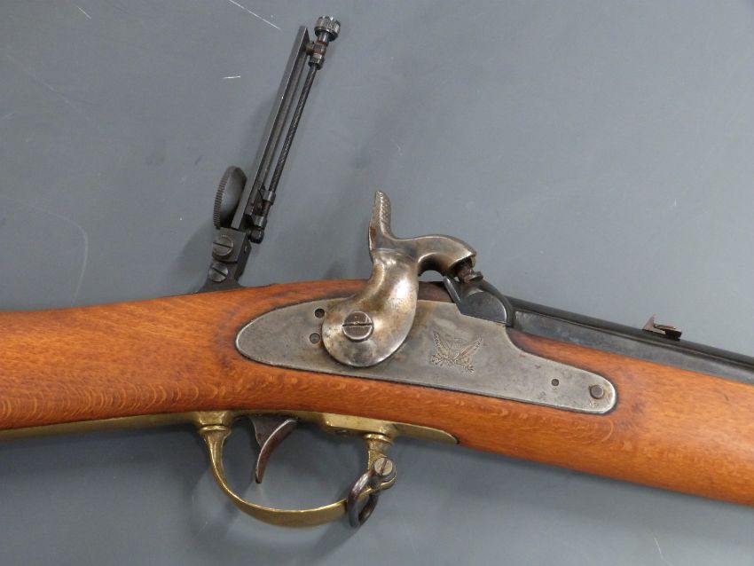 Italian Enfield pattern .451 2-band percussion hammer action rifle with eagle crest to the lock, brass trigger guard, storage compartment to stock, mounts and butt plate, sling suspension loops, pop-up long range ladder sights and 32.25 inch rifled barrel, overall length 123cm, serial number 280448 PLEASE NOTE THAT A VALID RELEVANT FIREARMS/SHOTGUN CERTIFICATE IS REQUIRED TO HANDLE/PURCHASE THIS ITEM.