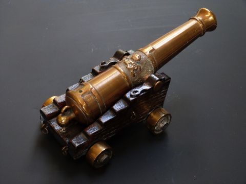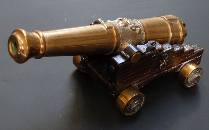 A bronze desk or signalling cannon with 7.5 inch graduated barrel, oak carriage and bronze wheels, overall length 20cm.