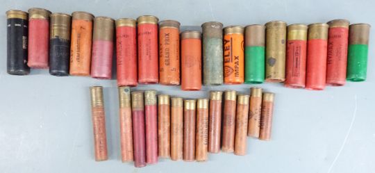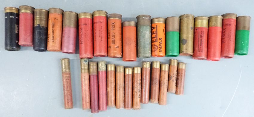 Thirty paper and brass cased collectable shotgun cartridges including Henry Atkin, Eley etc together with two shotgun cartridge belts. PLEASE NOTE THAT A VALID RELEVANT FIREARMS/SHOTGUN CERTIFICATE IS REQUIRED TO HANDLE/PURCHASE THIS ITEM.