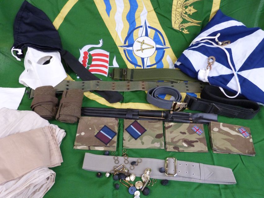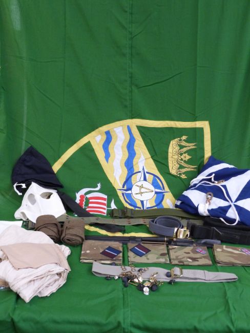 NATO and HQAFNW flags, RAF buttons, webbing belts, cleaning kit for .22-222 Rem etc
