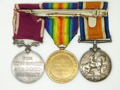 British Army WWI medals comprising War Medal and Victory Medal named to 26621 Sapper M P Craven, Royal Engineers together with his Long Service & Good Conduct Medal (1853117 Cpl)