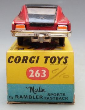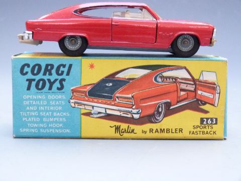 Corgi Toys diecast model Marlin Rambler Sports Fastback with red body, black roof and cream interior 263, in original box.