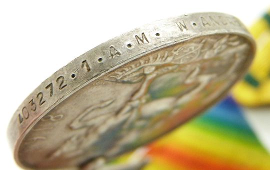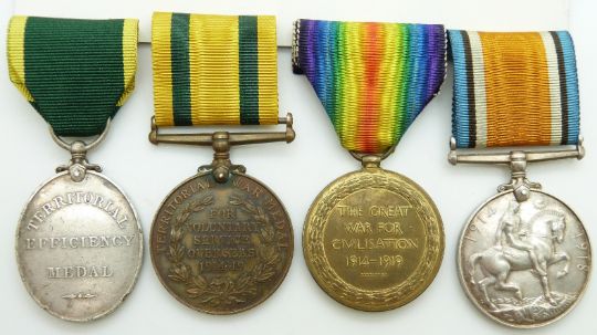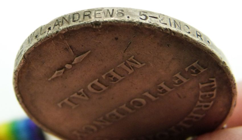 Royal Flying Corps WWI Territorial Force War Medal named to 403272 Pte W L Andrews, RFC together with his WWI War Medal and Victory Medal named to 403272 IAM W Andrews, RAF and his Territorial Army Efficiency Medal named to 4795303 Pte W L Andrews, Lincolnshire Regiment, with copy paperwork