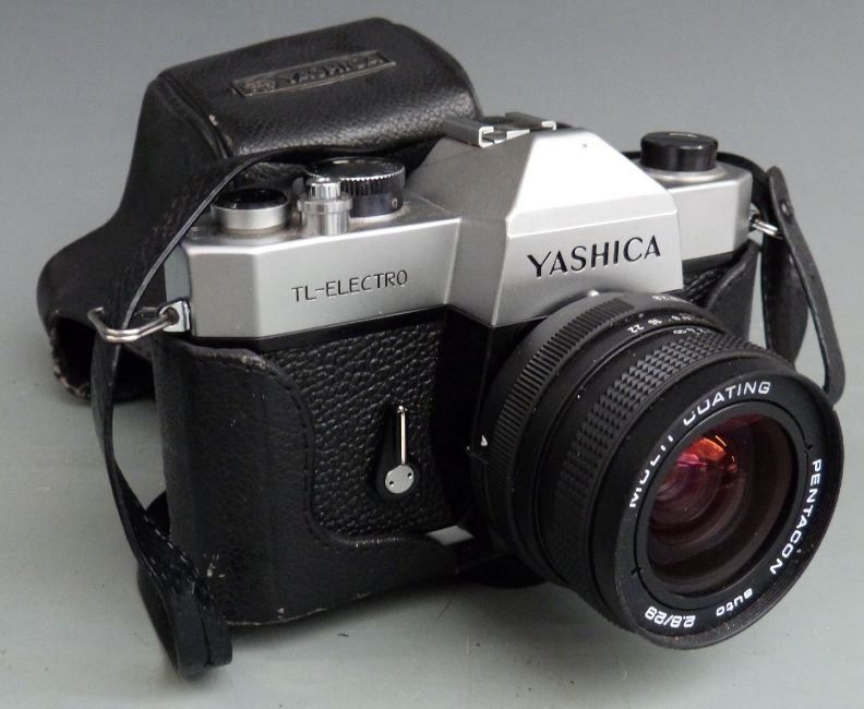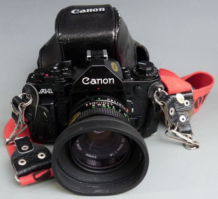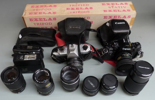 Cameras and acessories to include Canon A-1 with Canon 50mm 1:1.8, 35-105mm 1:3.5-4.5, 135mm 1:3.5 and 28mm 1:2.8 lenses, Chinon 1:2.8 135mm lens, Yashica TL-Electro with Pentacon 2.8/29 lens, Praktica 1:4.5 80-200mm lens, Yashica 50mm 1:1.9 etc