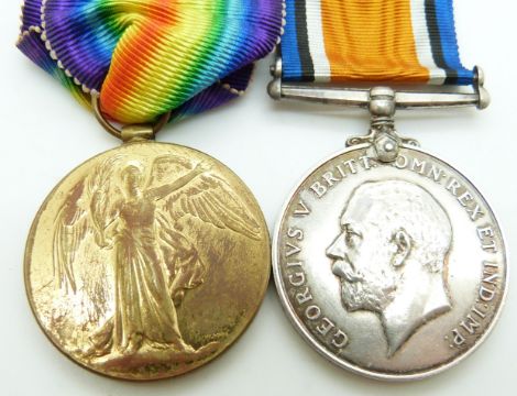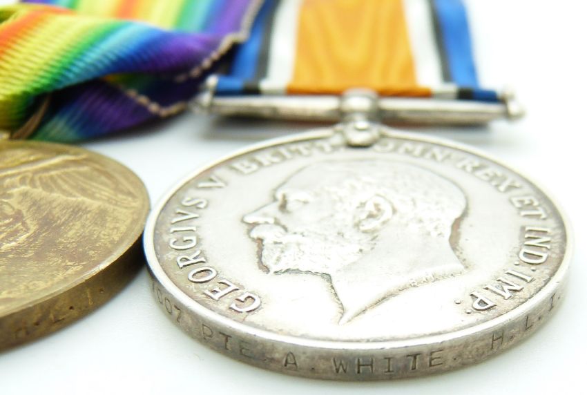 British Army WWI medals comprising War Medal and Victory Medal named to 7007 Pte A White, Highland Light Infantry