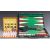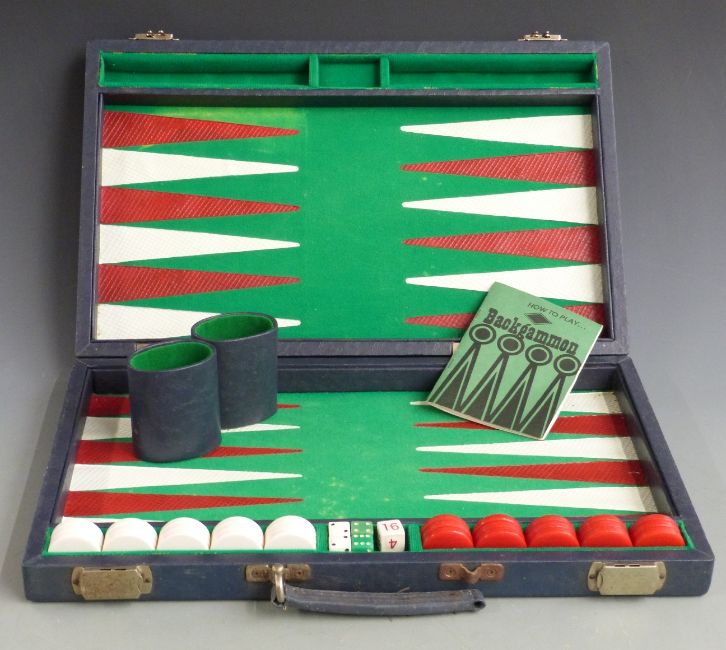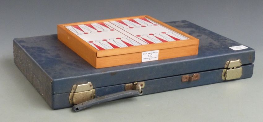 A de luxe backgammon set in faux snake skin leather case together with a travelling chess and backgammon set in wooden box.
