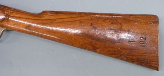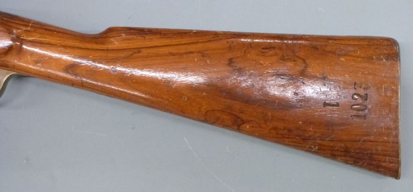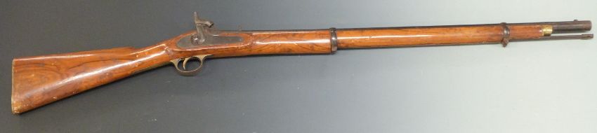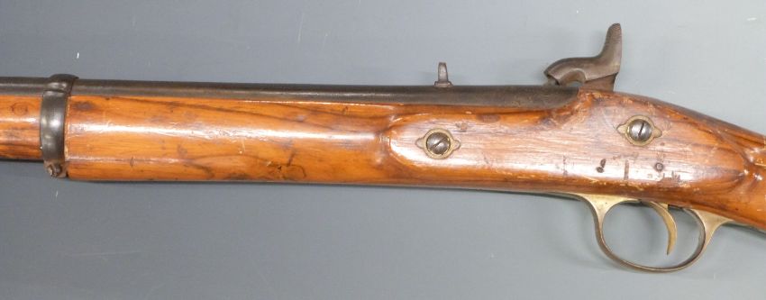 Two-band percussion hammer action gun with brass butt plate, trigger guard and mounts, stock stamped 1023 1, steel ram-rod and 32 inch barrel, overall length 121cm.
