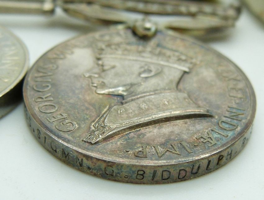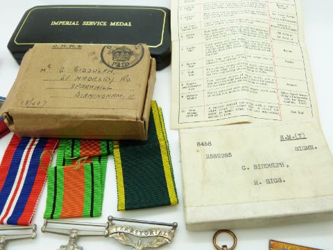 British Army WWII medals comprising 1939/1945 Star, Africa Star with 8th Army bar, Defence Medal and Efficiency Medal named to 2582285 Signalman G Biddulph, Royal Signals together with his Imperial Service Medal and boxes