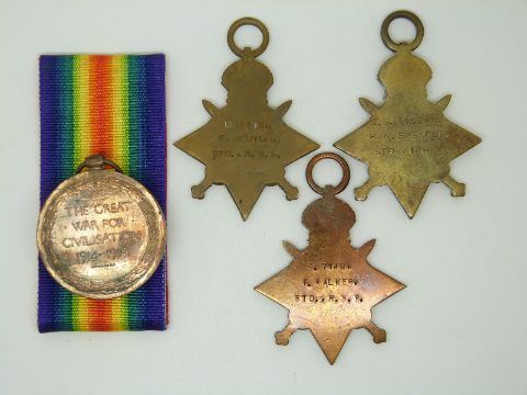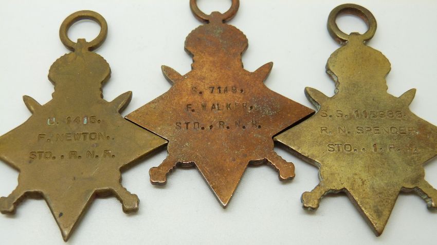 Royal Navy WWI medals comprising three 1914/15 Stars named to 110988 R N Spencer RN, 1415 F Newton RNR and 7149 F Walker RNR and Victory Medal to 347271 F F Farenden RN