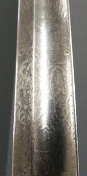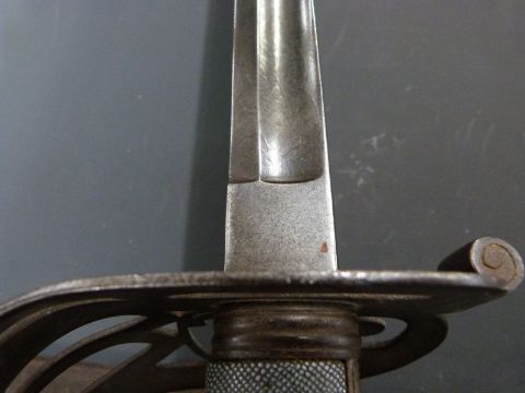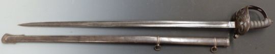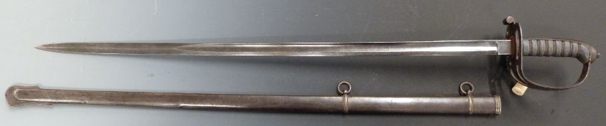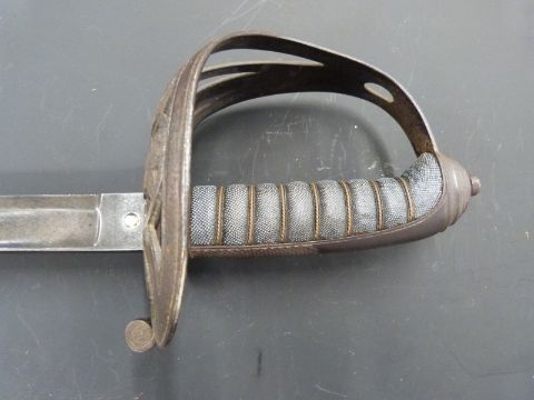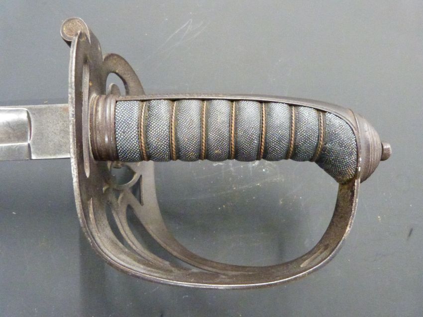 British Army 1827 pattern Rifle officer's sword with strung bugle motif within the knuckle brow, shagreen and wire handle and 82cm fullered blade with royal cypher and Star of David proof mark, in metal scabbard.