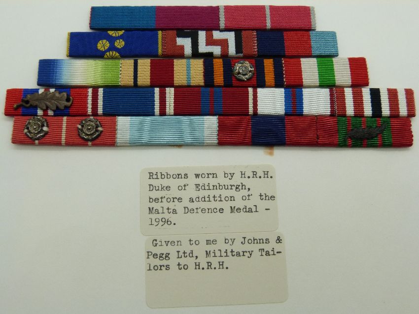 Medal ribbons worn by H.R.H. Duke of Edinburgh before the addition of the Malta Defence Medal 1996, given to the vendor by John and Pegg Ltd, military tailors to HRH