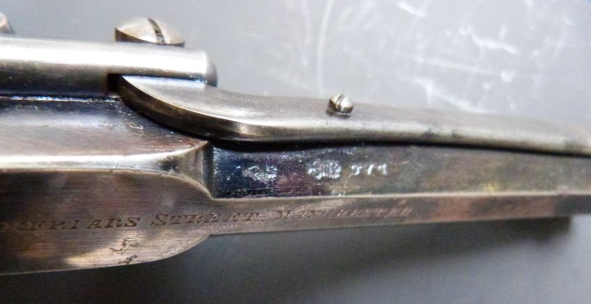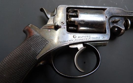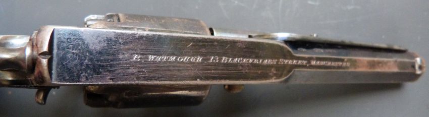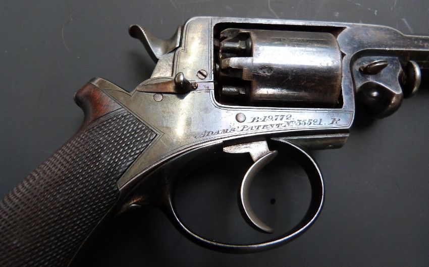 Adams for R Watmough of Manchester 120 bore five-shot double action revolver with frame engraved 'B. 19772 Adams' Patent No35521. P.', chequered grips and 4.25 inch barrel engraved 'R. Watmouth 13 Blackfriars Street Manchester', overall length 26cm, in fitted wooden case with embossed powder flask, accessories and key.