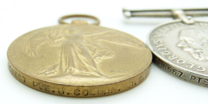 British Army WWI medals comprising War Medal and Victory Medal named to 016667 Pte J Colman, Army Ordnance Corps