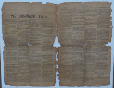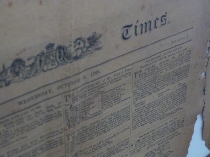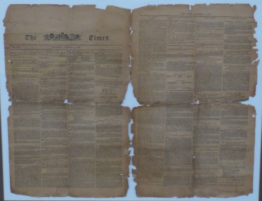 Framed edition of 'The Times' newspaper number 4298 dated October 3 1798, of Lord Nelson interest