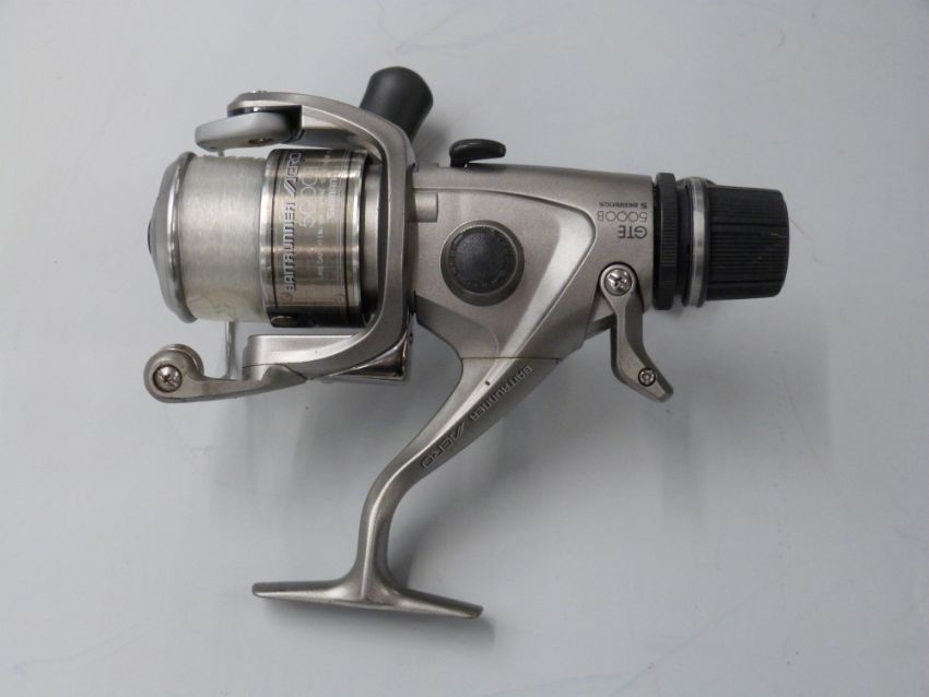 Three Shimano fixed spool fishing reels in boxes, comprising Baitrunner Aero GTE 5000B, Match 2500S and Nexave 1000RA