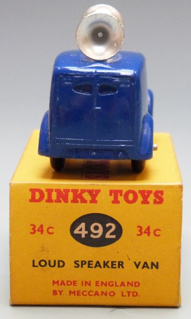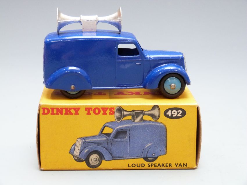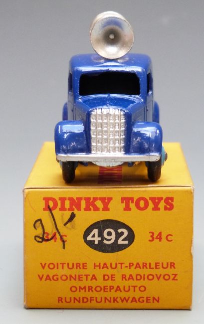 Dinky Toys diecast model Loud Speaker Van with dark blue body, light blue hubs and silver speaker, 492, in original box.