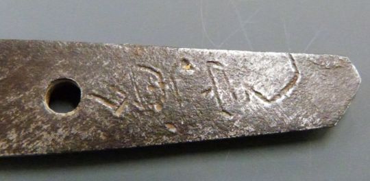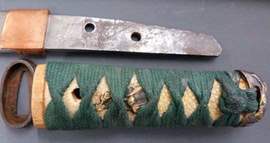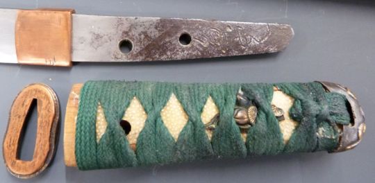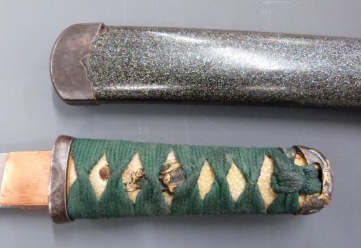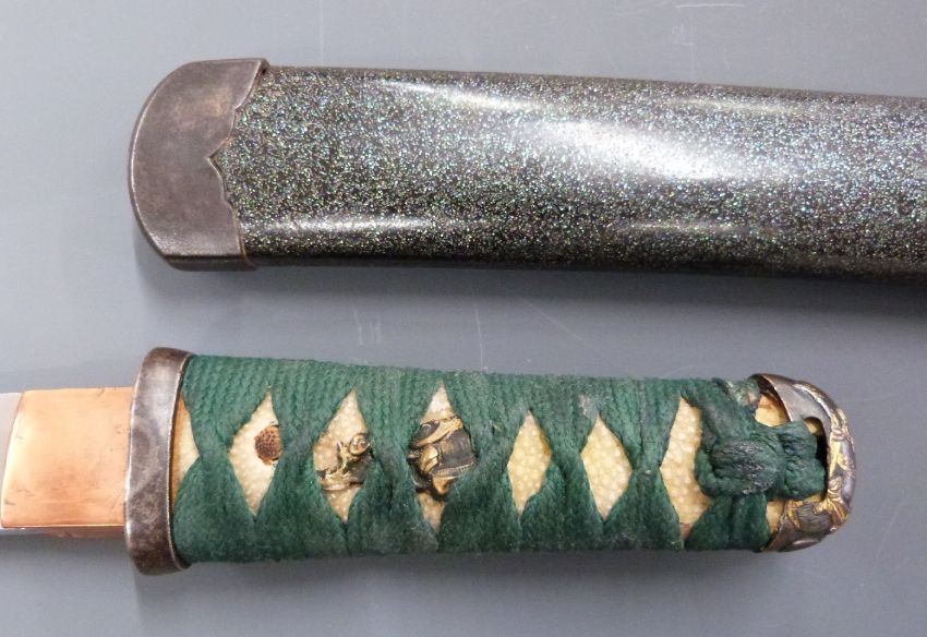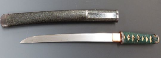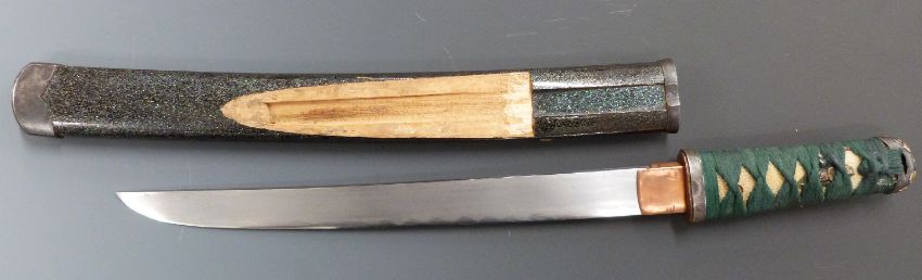 Japanese tanto blade with flecked saya signed Kanesada, length 29.5cm