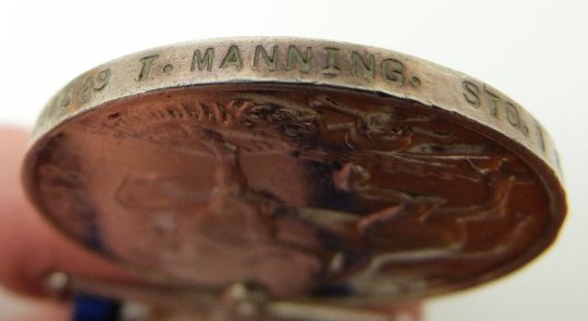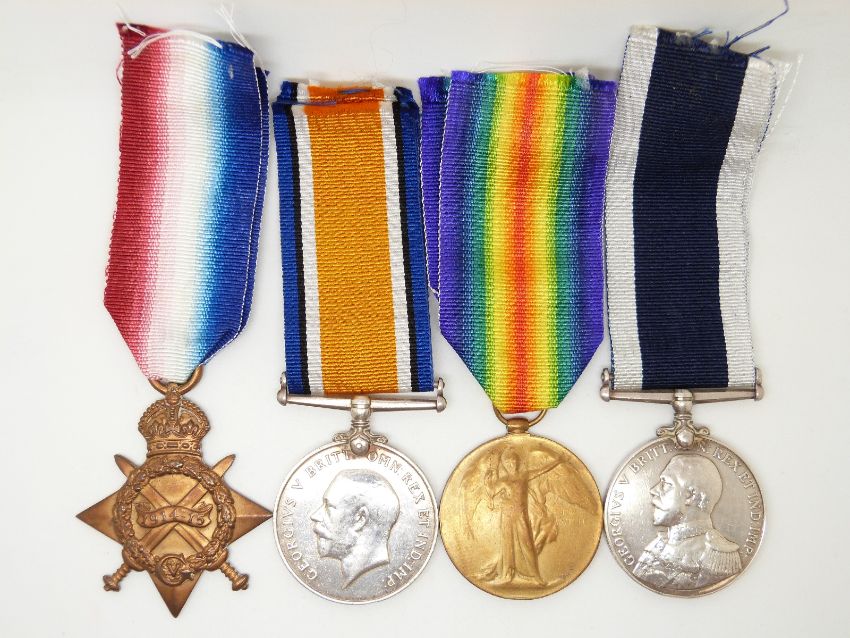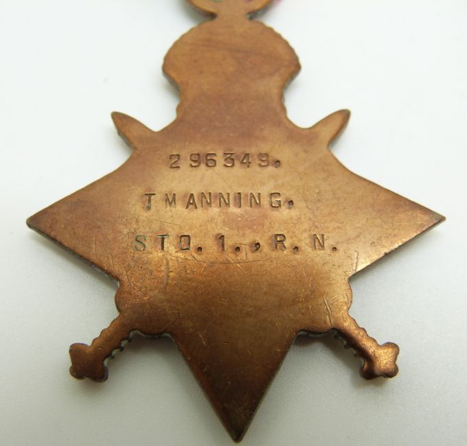 Royal Navy WWI medals comprising 1914/1915 Star, War Medal and Victory Medal named to 296349 T Manning, RN together with his Long Service & Good Conduct Medal (George V), HMS Victory