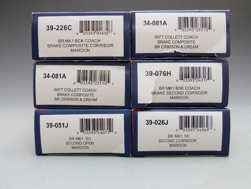 Six Bachmann 00 gauge BR coaches in maroon and crimson & cream, all in original boxes.