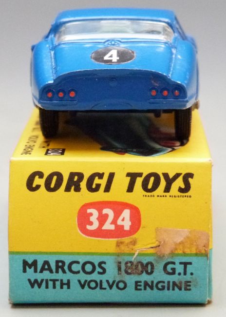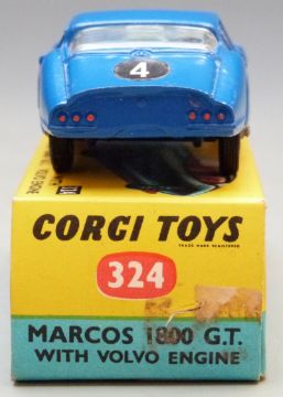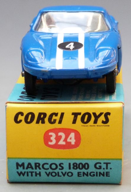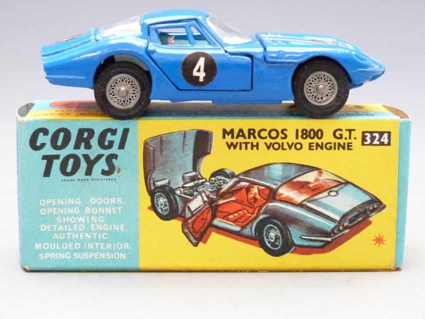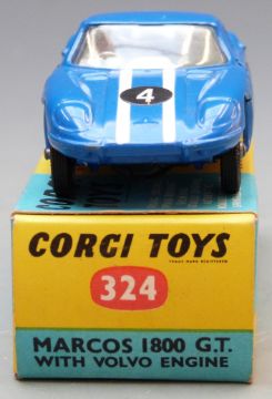 Corgi Marcos 1800 GT with Volvo engine, blue body, driver and racing number 4, 324, in original box.