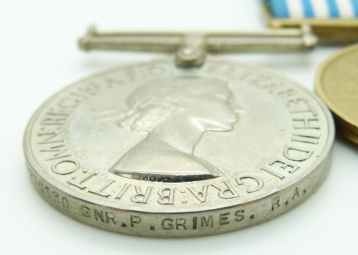 British Army Korea Medal named to 22276130 Gunner P Grimes, Royal Artillery together with his United Nations Korea medal, with boxes