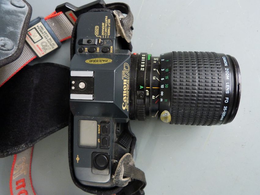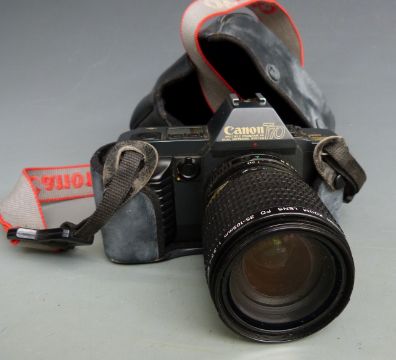 Canon T70 SLR camera with Canon 35-105mm 1:3.5-4.5 and Tamron 200mm 1:3.5 lenses and a flash gun