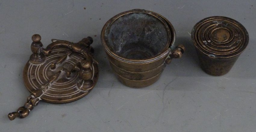 Middle Eastern or similar set of bronze nesting cup weights with carrying handle to lid, height 10cm
