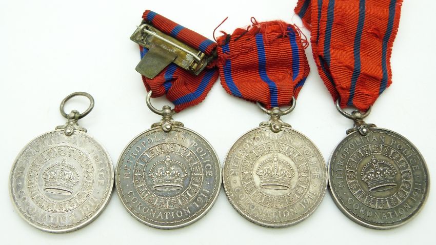 Four Coronation (Metropolitan Police) Medals 1911 named to PC W Arthurton, PC R Nash, PC R Moye and PC A Philips