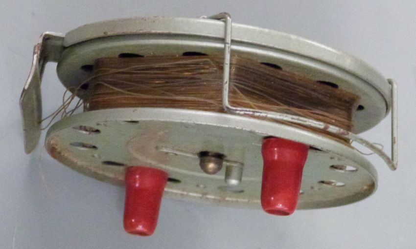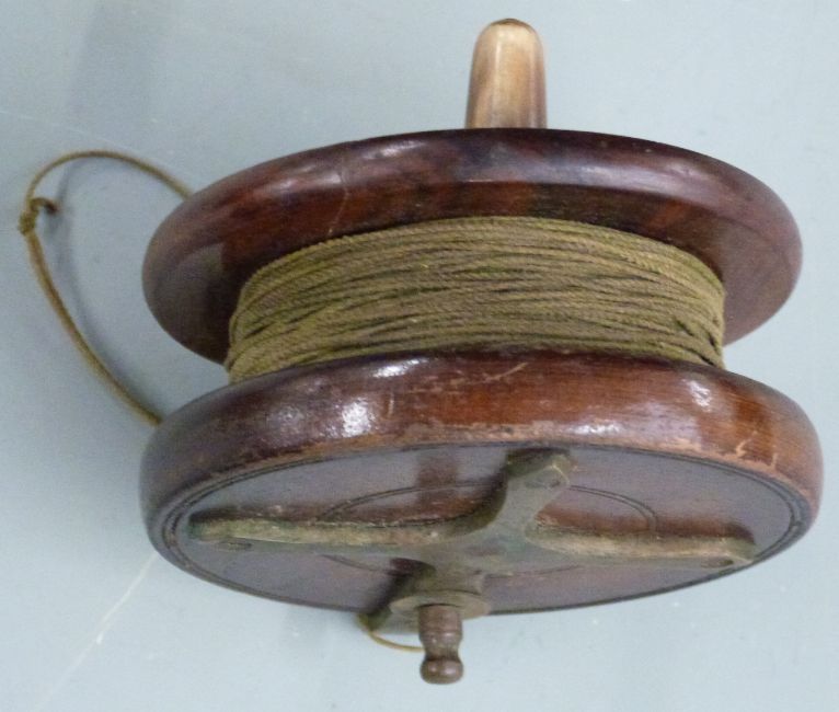 A collection of five vintage wooden and Bakelite fishing reels with a canvas bag