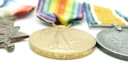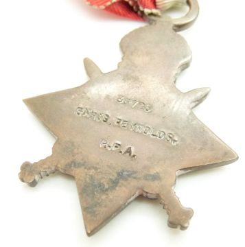 British Army WWI medals comprising 1914/1915 Star, War Medal and Victory Medal named to Bombardier G Reynolds, Royal Artillery (Gunner on Star)