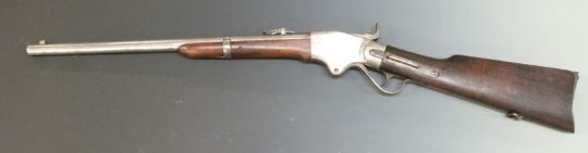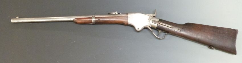 Spencer model 1865 .50 calibre underlever repeating percussion hammer action carbine rifle with pop-up ladder sights, stock stamped with indistinct markings, belt loop, top flat stamped 'Spencer Repeating Rifle Boston Mass Pat'D March 1860' and 22 inch barrel, overall length 99cm, serial number 38561.
