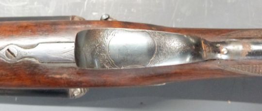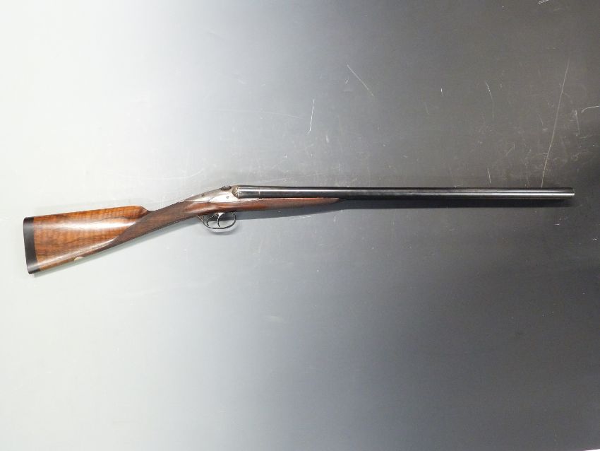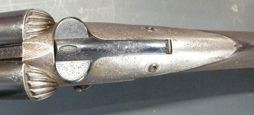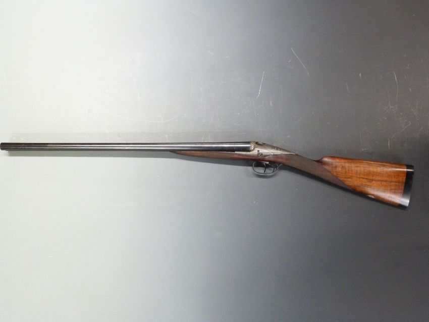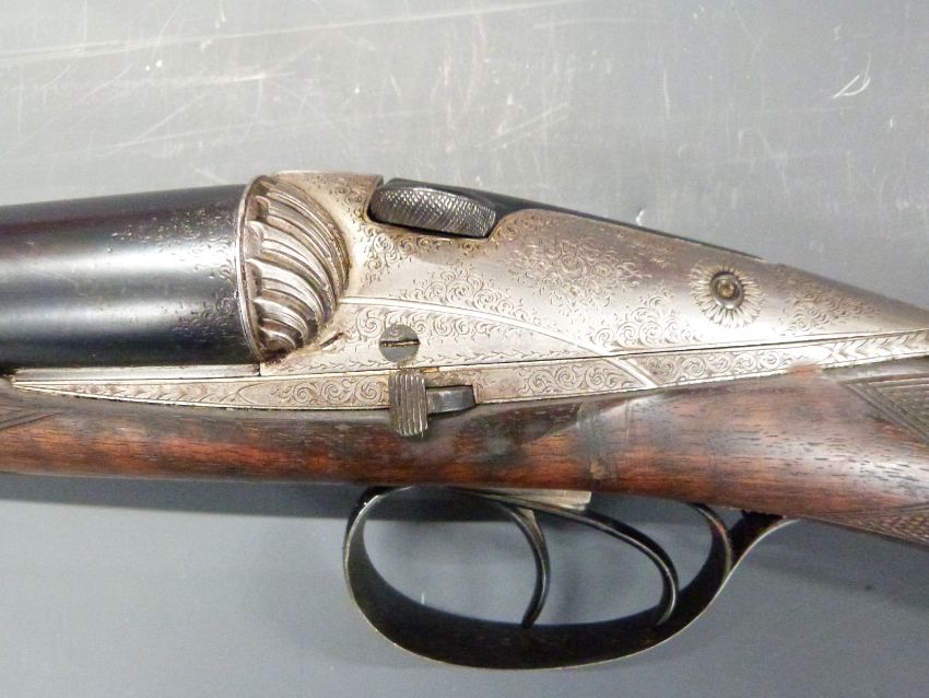 Darne 12 bore side by side shotgun with engraved sliding action and trigger guard, chequered semi-pistol grip and forend, double trigger and 25.75 inch barrels, overall length 107.5cm, serial number 4030. PLEASE NOTE THAT A VALID RELEVANT FIREARMS/SHOTGUN CERTIFICATE IS REQUIRED TO HANDLE/PURCHASE THIS ITEM.
