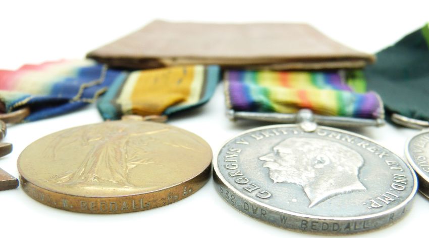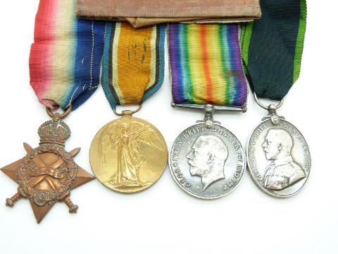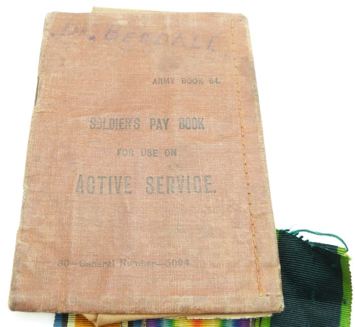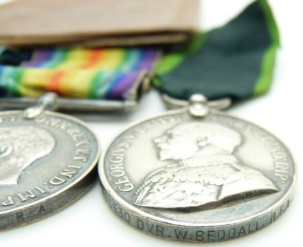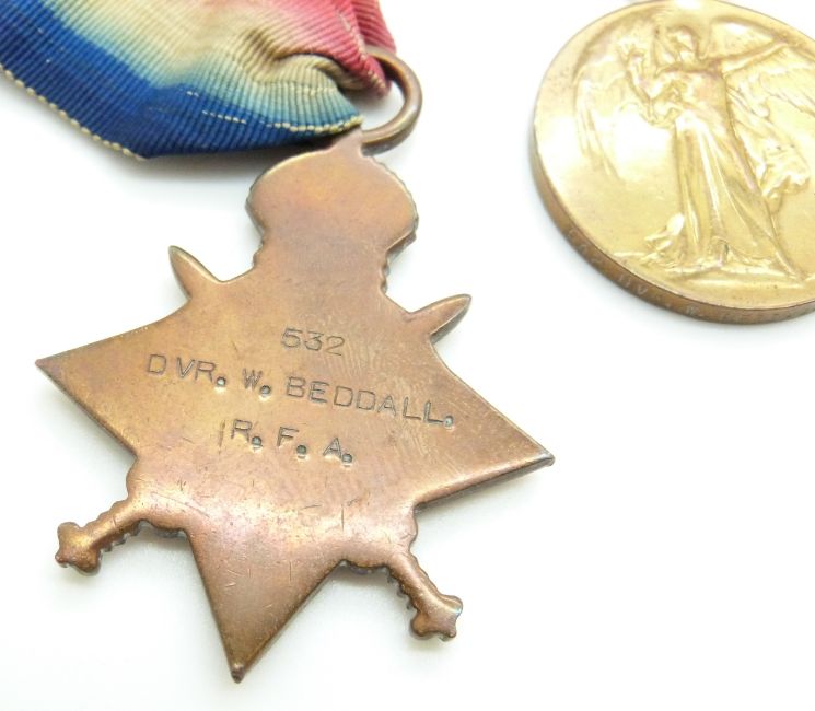 British Army WWI medals comprising 1914/1915 Star, War Medal and Victory Medal named to 532 Driver W Beddall, RFA together with his Territorial Force Efficiency Medal (890530) and pay book