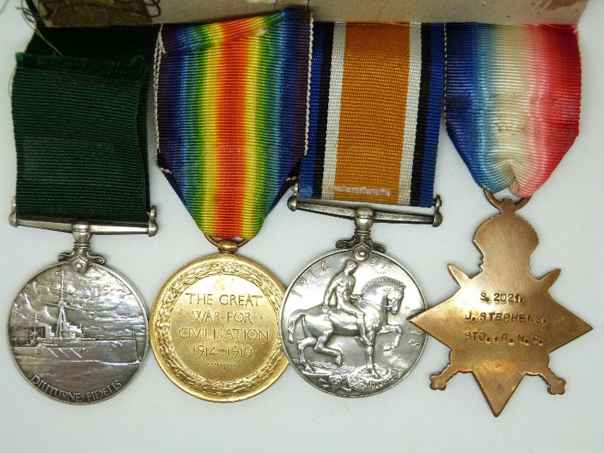 Royal Navy WWI medals comprising 1914/1915 Star, War Medal and Victory Medal named to 2021 J Stephens, RNR together with his Long Service & Good Conduct Medal (for 2618U)