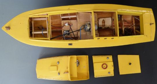 Model remote control boat of a Halvorsen 38ft seaplane tender with electric motor and speed control, length 95cm.